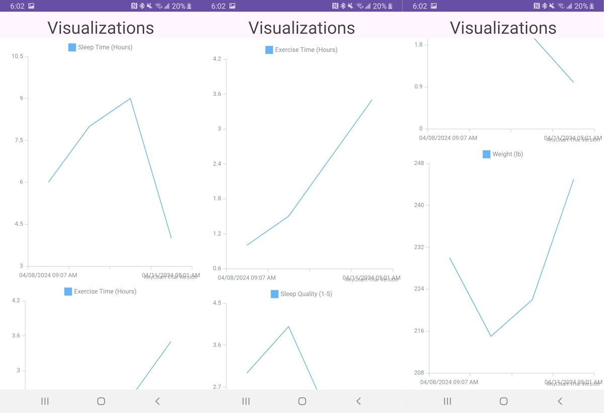 Android fitness tracking app using Room API to store data and AnyChart for line chart visualizations. Both of these packages were new to me while developing this application. The user can add log entries, delete entries, and look at graphs that represent the data. Graphs are shown for sleep time, exercise time, sleep quality, and weight changes.